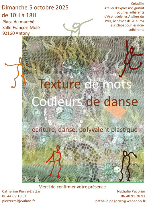 ● Textures des mots, couleurs de danse (danse, écriture, polyvalent plastique) : 5 octobre (10h/18h30), à Antony (92), avec Nathalie PEGORIER (06 40 91 78 91, nathalie.pegorier@wanadoo.fr) et Catherine PIERRE-ELATTAR (06 75 68 95 16).